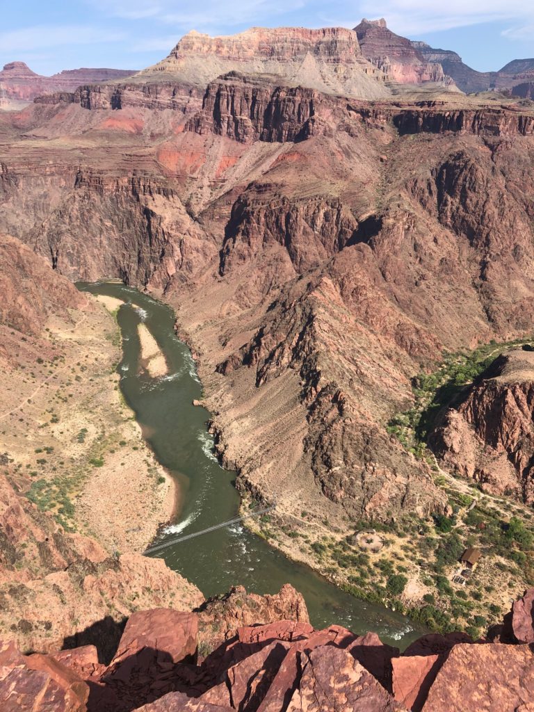 Seeing the Colorado River for the first time was exciting for two reasons. One, it was huge, even at our altitude, and two, it meant we were almost to our destination. We walked through a short tunnel and then across the suspension bridge to get to the other side. From there, we were only about 30 minutes from Phantom Ranch.
