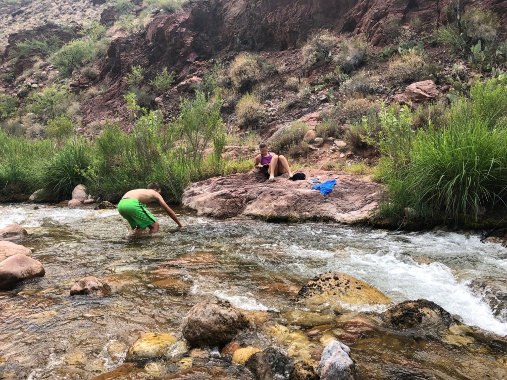 That being said, I would highly recommend hiking shoes for their great traction. Be sure to break them in prior to your trip so you don’t acquire blisters. There is an outhouse about halfway down but no running water so be sure to bring enough! We had camelbacks along with several bottles of water. We snacked along the way and then took a lunch break at the midway point.