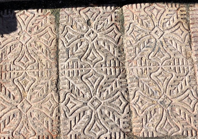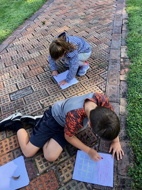 Our first stop was at the town’s church. This church uses four different brick patterns to create a stunning architectural structure. The kids did brick rubbings on two of the four styles and then drew the third style. They had a fun time coming up with names for the designs. Waffle/Lego, Boombox/Speakers, and Horn/Steering Wheel were our ‘official’ terms.