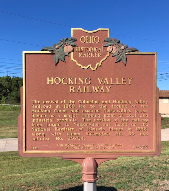 We started at the Nelsonville Train Depot to check out the old train cars. We were all fascinated by the majestic size of the ice breaker engine. There are a few passenger cars and several caboose cars parked on the track to admire. We found the caboose that is mentioned in the Ohio plaque. The kids had fun playing pretend ticket master and checking out the depot.