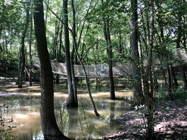The next stop was the Scioto Grove Metro Park. You could easily spend a good portion of your day here. We made a short stop at the very cool webbed playground, drove to the lodge where we hiked to the suspension bridge (head to your right from the lodge) and then checked out the beaver dam, cattails and frogs at the pond on the way out. There are SO many frogs! It was cool watching them jump across the water as we walked along the edge.