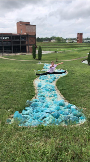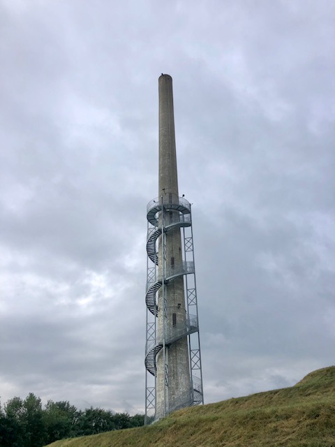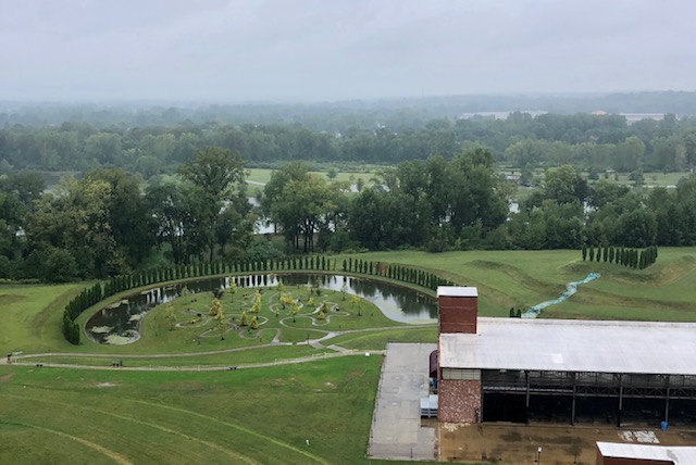 Lace up your tennis shoes and get ready to hit the stairs. Ariel Foundation Park, on the outskirts of town, has turned the old glass factory chimney into an observation tower. It’s 140′ in the air and 224 steps up, but what a view! The climb tested the nerves of some of my crew but all of them mastered their fears and achieved our goal. From the top, you have a great view of the terraces, labyrinth, glass river and building ruins.