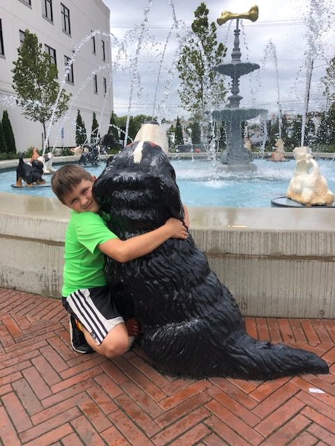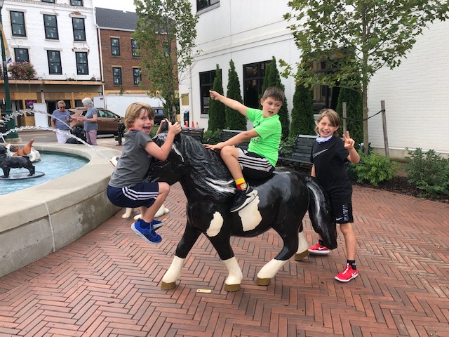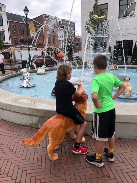 Continue walking south and you’ll come to an absolutely adorable dog water fountain. Whimsical and uplifting, this newly installed fountain adds so much to the downtown vibe. The kids found their favorite dogs and even a shetland pony.